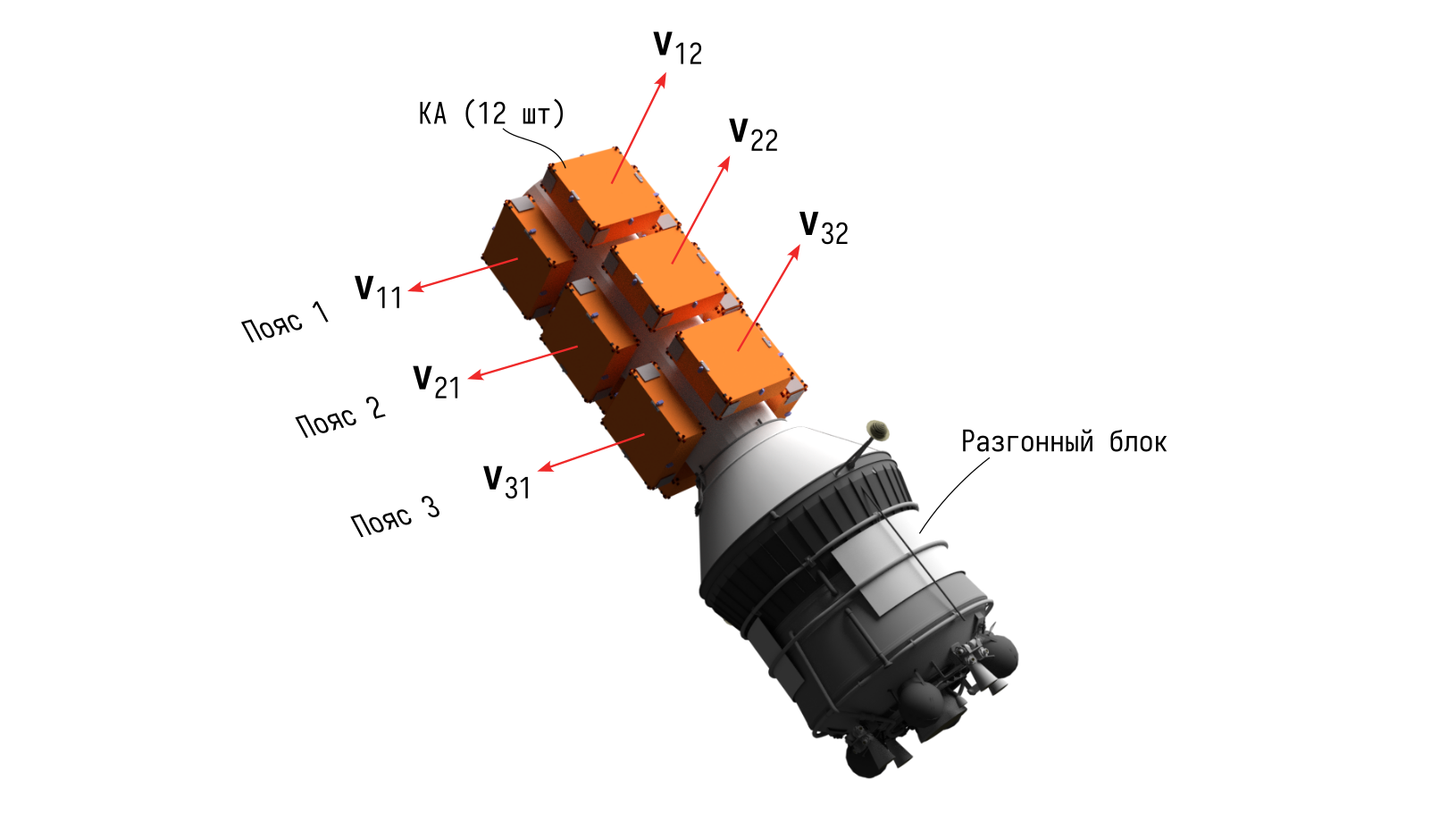 - КА отделяются тремя группами с интервалом \(\Delta T\) между каждой группой; в каждой группе одновременно отделяются по 4 КА, которые расположены в одном поясе адаптера РБ.