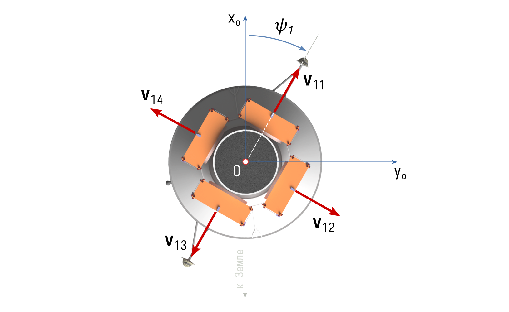 - КА отделяются в плоскости орбиты; при отделении КА продольна ось РБ ориентирована вдоль оси \(Oz_o\) орбитальной подвижной системы координат РБ.